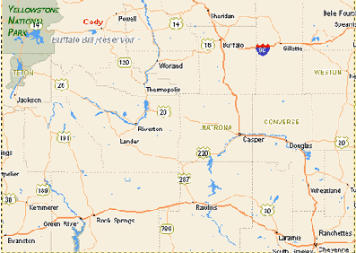 Cody Wyoming has a reasonably sized airport that is typically served by Delta Airlines and United Airlines. Billings Montana is within an easy drive and has a larger airport with more connections. Salt Lake City is 400 miles from Cody and Denver is 500 miles away. Most roads in the area are well maintained 2 lane state highways with 65mph speed limits. Rental cars are available in Cody and Billings. Click on the map to view a close-up of northwest Wyoming.